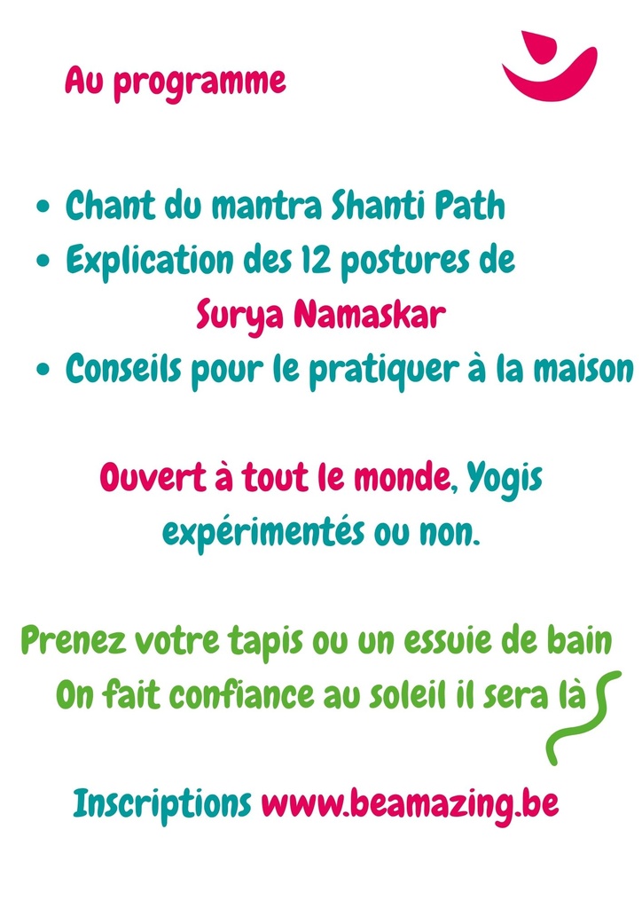 Viens découvrir la salutation au soleil et bouger un peu ce samedi en plein air au PDW près du Tennis - trouvez la mystery machine.